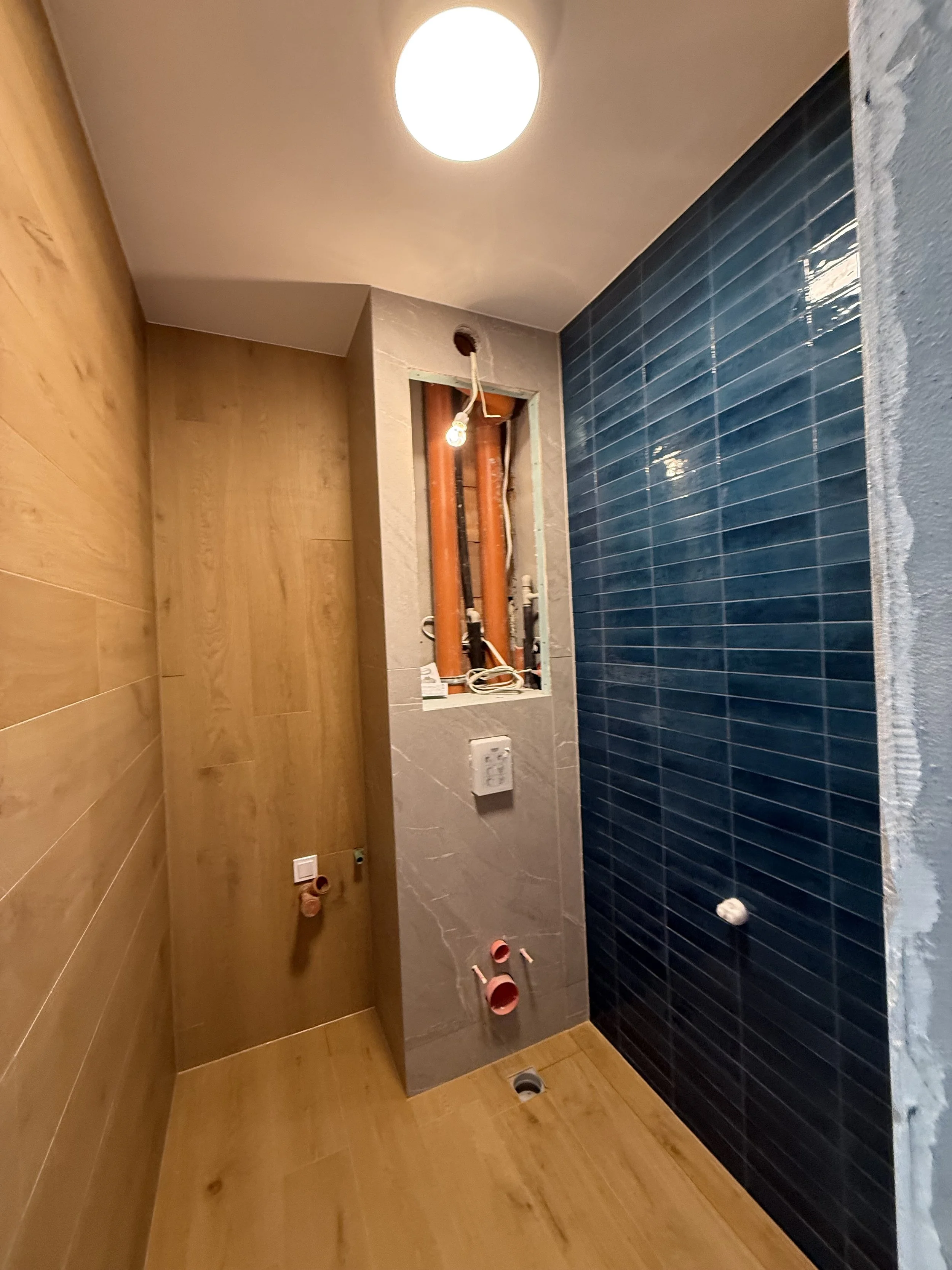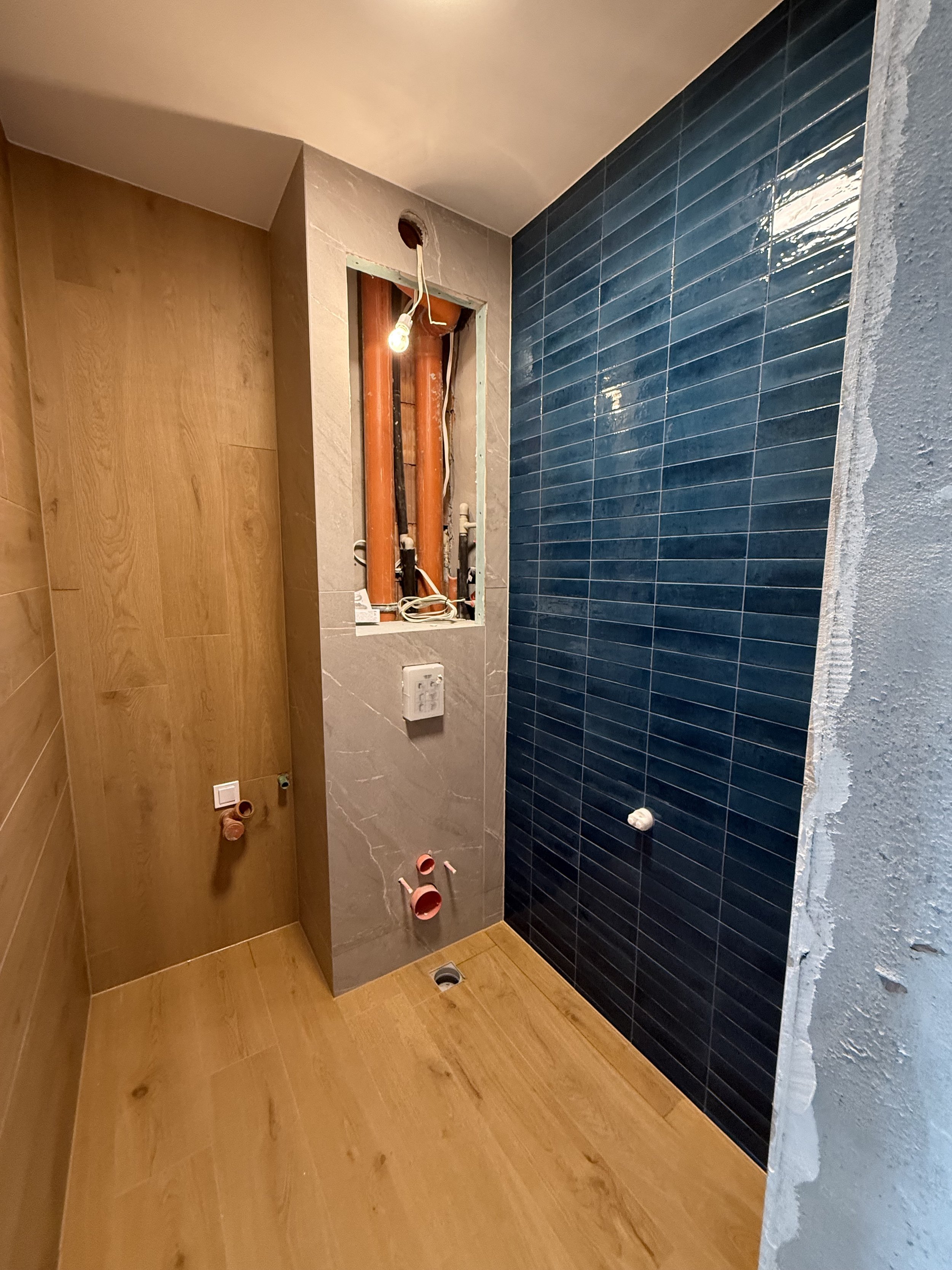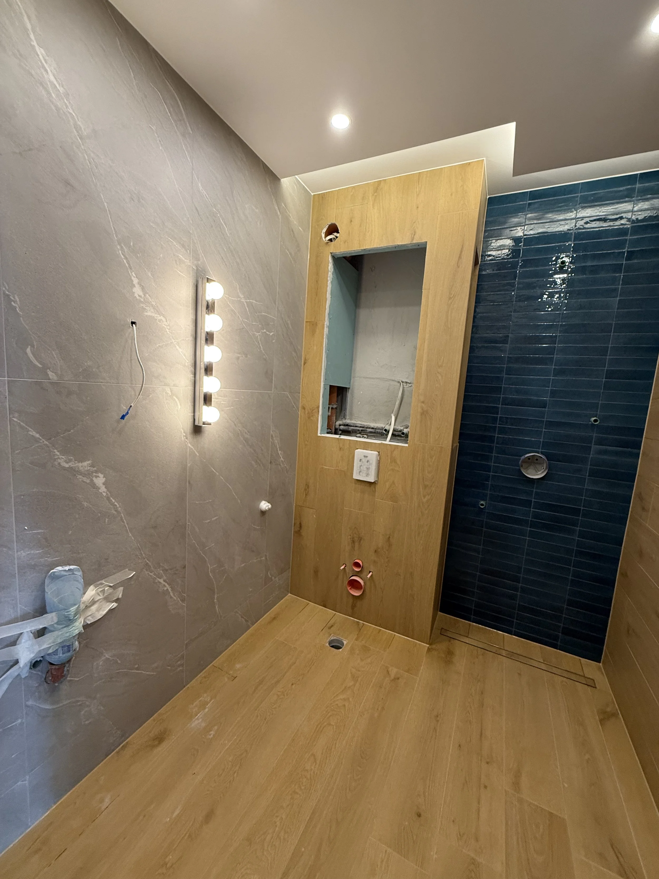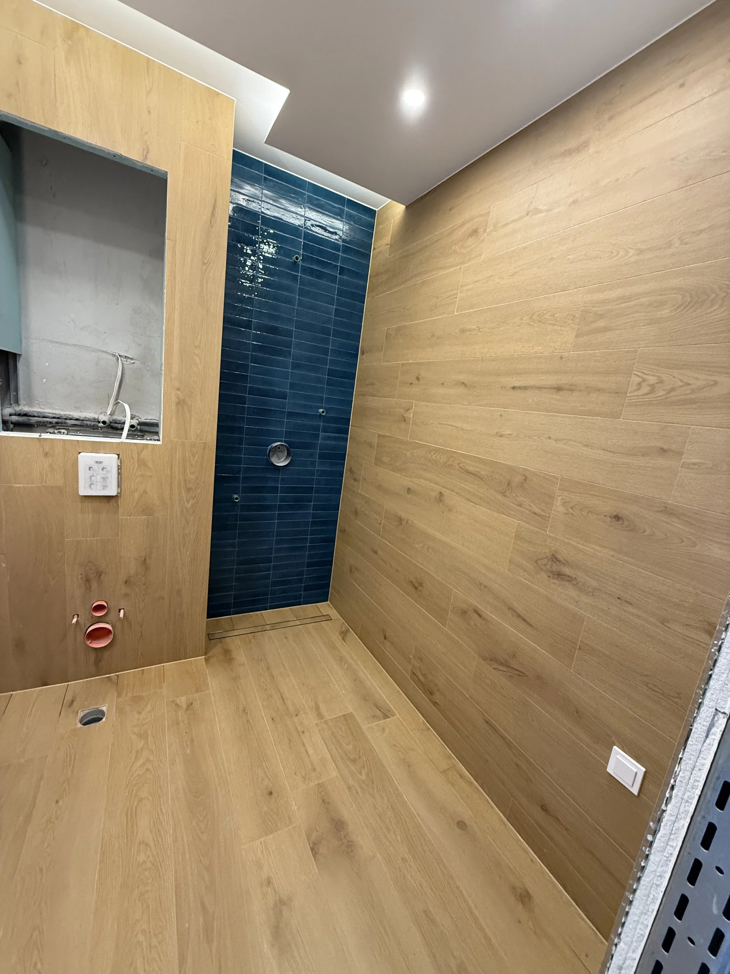 Дизайнерски проект за баня с хармонизиращи се гранитогрес с дървесен фладер и балансираща акцентна стена със сини керамични плочки придават вкус на всяка една баня и разгръщат характера на интериорното пространство.